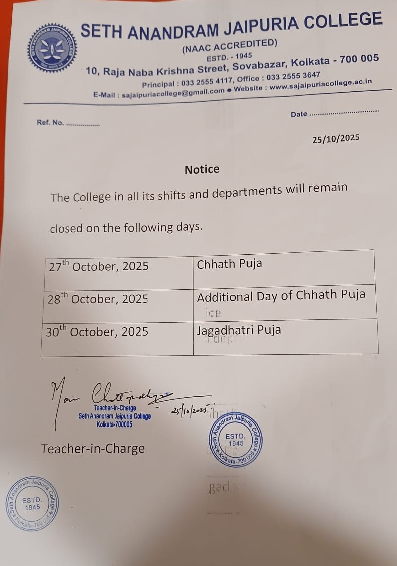 Notice regarding Chaat Puja and Jagdhatri Puja.