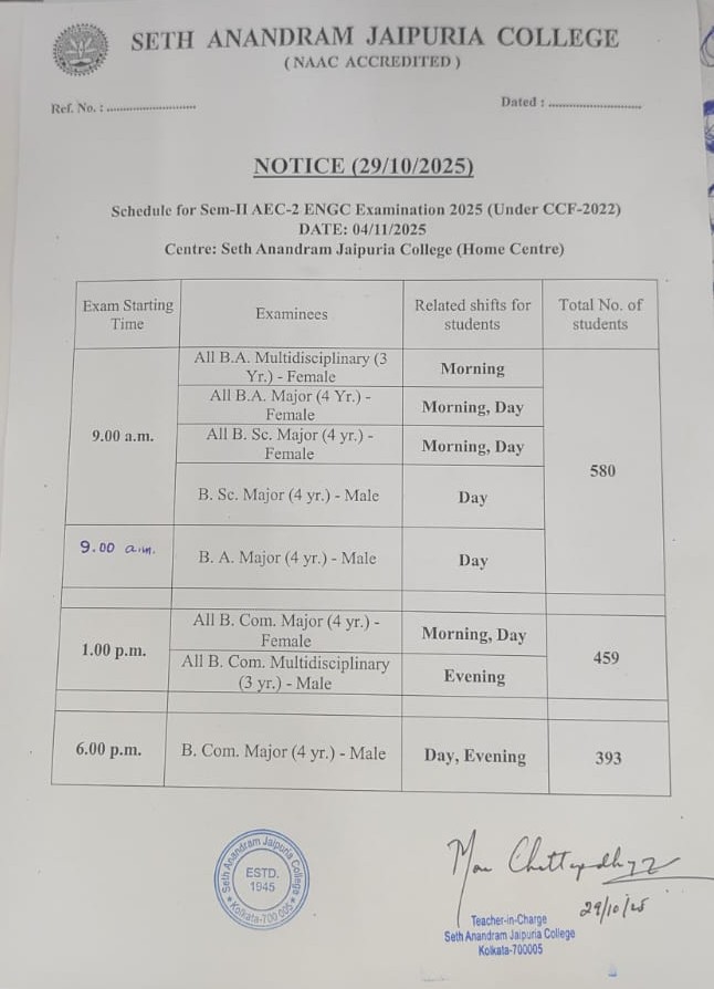 Notice regarding schedule for sem 2 AEC-2 ENGC (04/11/2025) Examination 2025 (under CCF-2022).